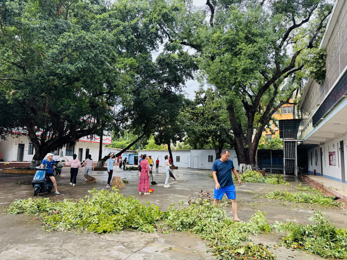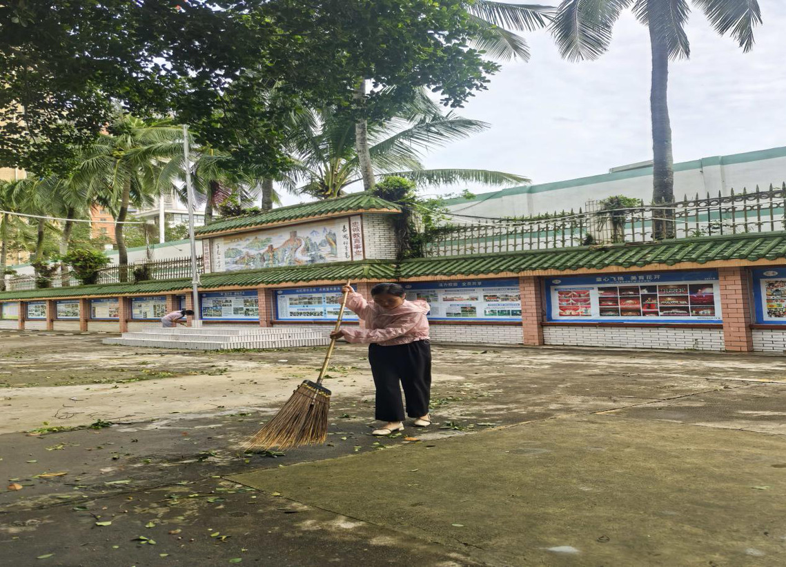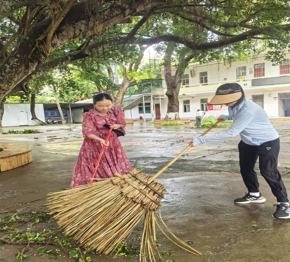 台风过后,校园内随处可见倒伏的树木枝叶、淤积的污泥和杂物,部分设施也受到不同程度的影响。按照海师大校长专题会议要求,附小党支部书记、校长梁胜娟带领学校班子成员,积极组织在海口的教职工迅速返校,高效开展灾后清理修复工作。大家分工明确,默契配合:有的挥动扫帚清理落叶断枝,有的手持高压水枪冲洗地面淤泥,有的合力扶正加固被风吹倒的绿植,有的仔细检查电路、教学设备的安全状况……汗水湿透了衣背,但没有人叫苦叫累,心中只有一个共同的信念——尽快让校园恢复原貌,为孩子们提供一个干净、安全的学习环境。