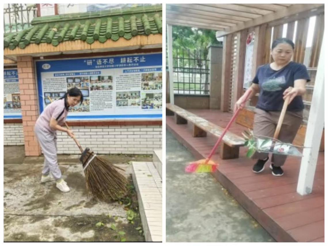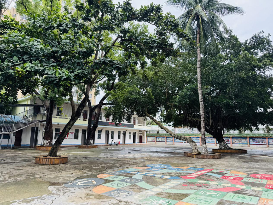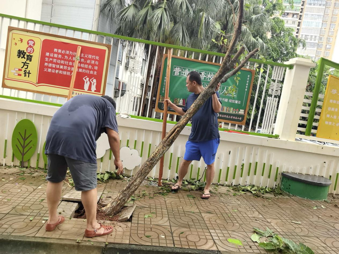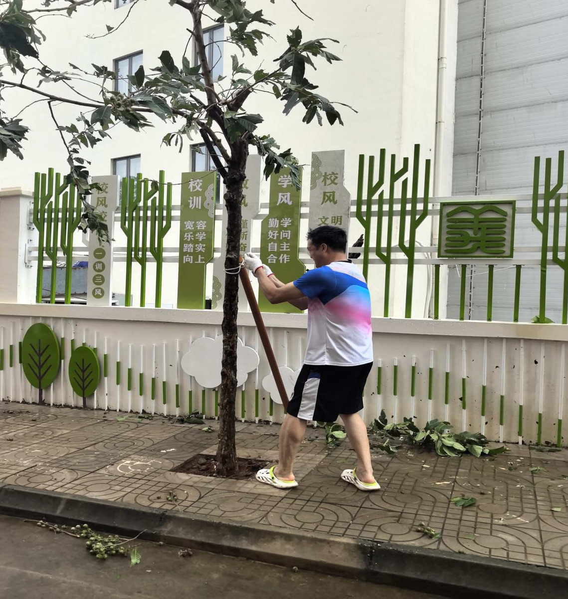 台风过后,校园内随处可见倒伏的树木枝叶、淤积的污泥和杂物,部分设施也受到不同程度的影响。按照海师大校长专题会议要求,附小党支部书记、校长梁胜娟带领学校班子成员,积极组织在海口的教职工迅速返校,高效开展灾后清理修复工作。大家分工明确,默契配合:有的挥动扫帚清理落叶断枝,有的手持高压水枪冲洗地面淤泥,有的合力扶正加固被风吹倒的绿植,有的仔细检查电路、教学设备的安全状况……汗水湿透了衣背,但没有人叫苦叫累,心中只有一个共同的信念——尽快让校园恢复原貌,为孩子们提供一个干净、安全的学习环境。
