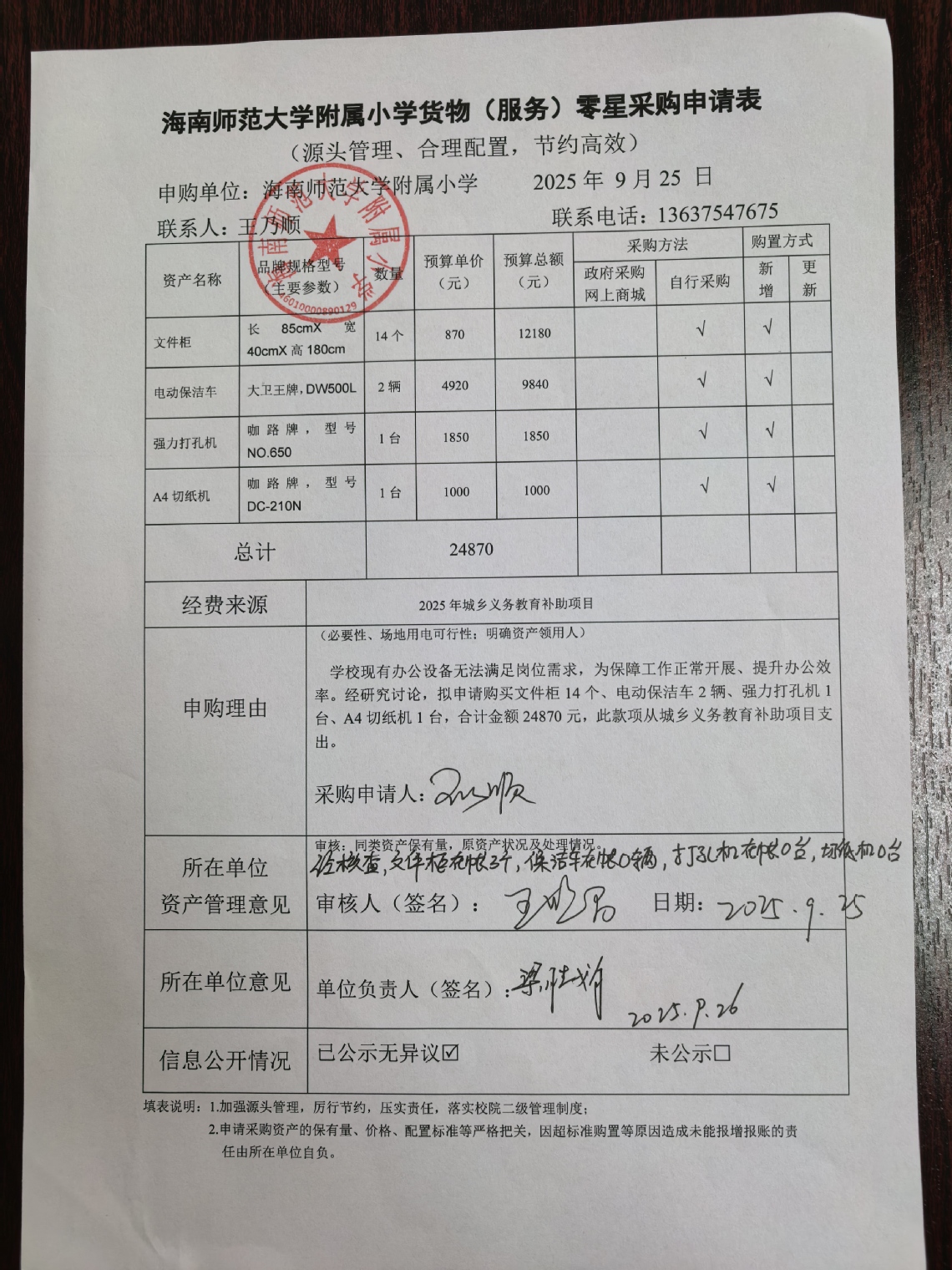 学校现有办公设备无法满足岗位需求,为保障工作正常开展、提升办公效率。经研究讨论,拟申请购买文件柜14个、电动保洁车2辆、强力打孔机1台、A4切纸机1台,合计金额24870元。
